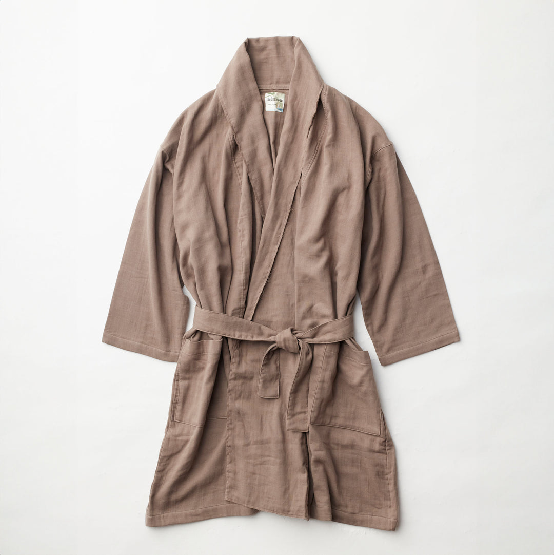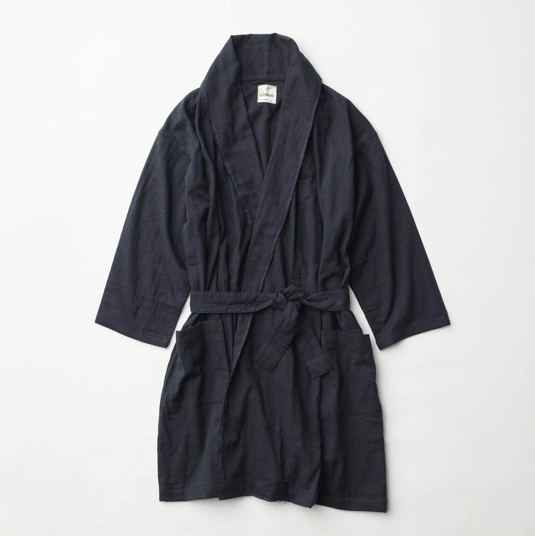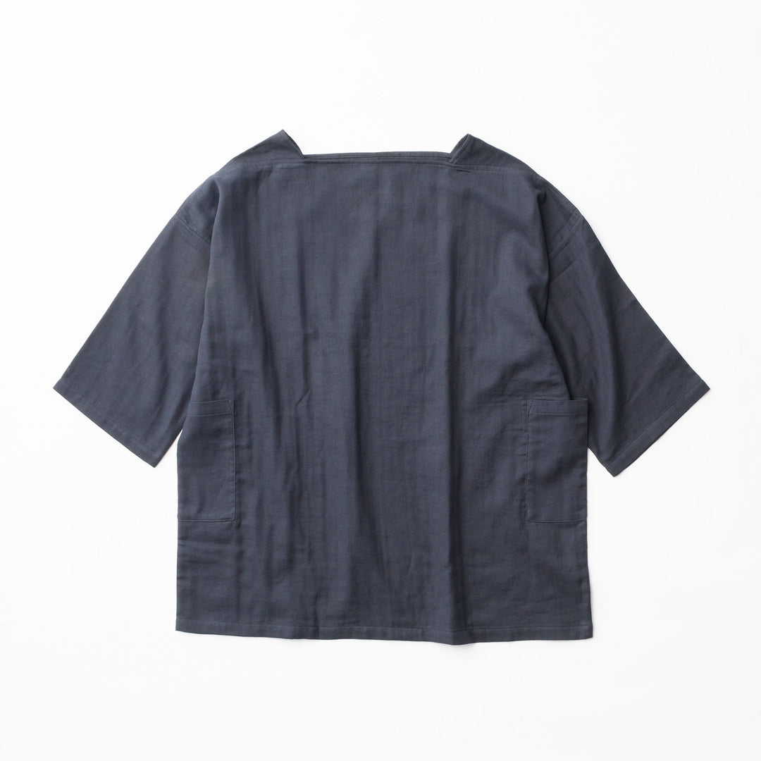 京都で織られたダブルガーゼを贅沢に使用した、オールシーズン対応のセットアップ。層の間に生まれる空気がやわらかく包み込み、寒い季節には保温性を、暑い季節には吸湿性と通気性を提供します。