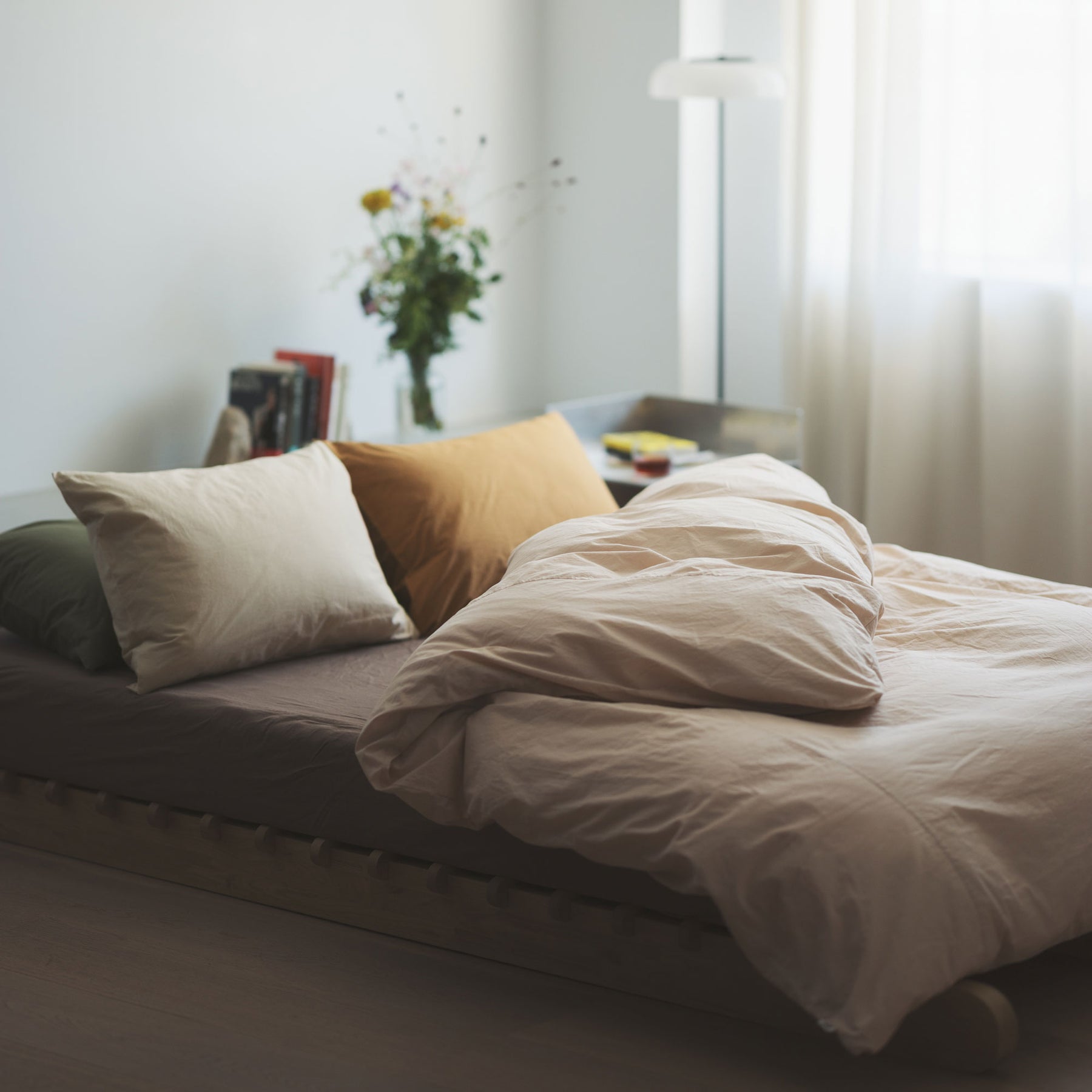 コットンブロードは、季節を問わずに使える平織の綿生地。高密度に織り上げられた綿100%の糸は、通気性と強度を兼ね備えながら、しなやかでやわらかな風合いを実現しました。洗いざらしの質感は使うほどに馴染み、日常の寝室に穏やかな表情を添えます。