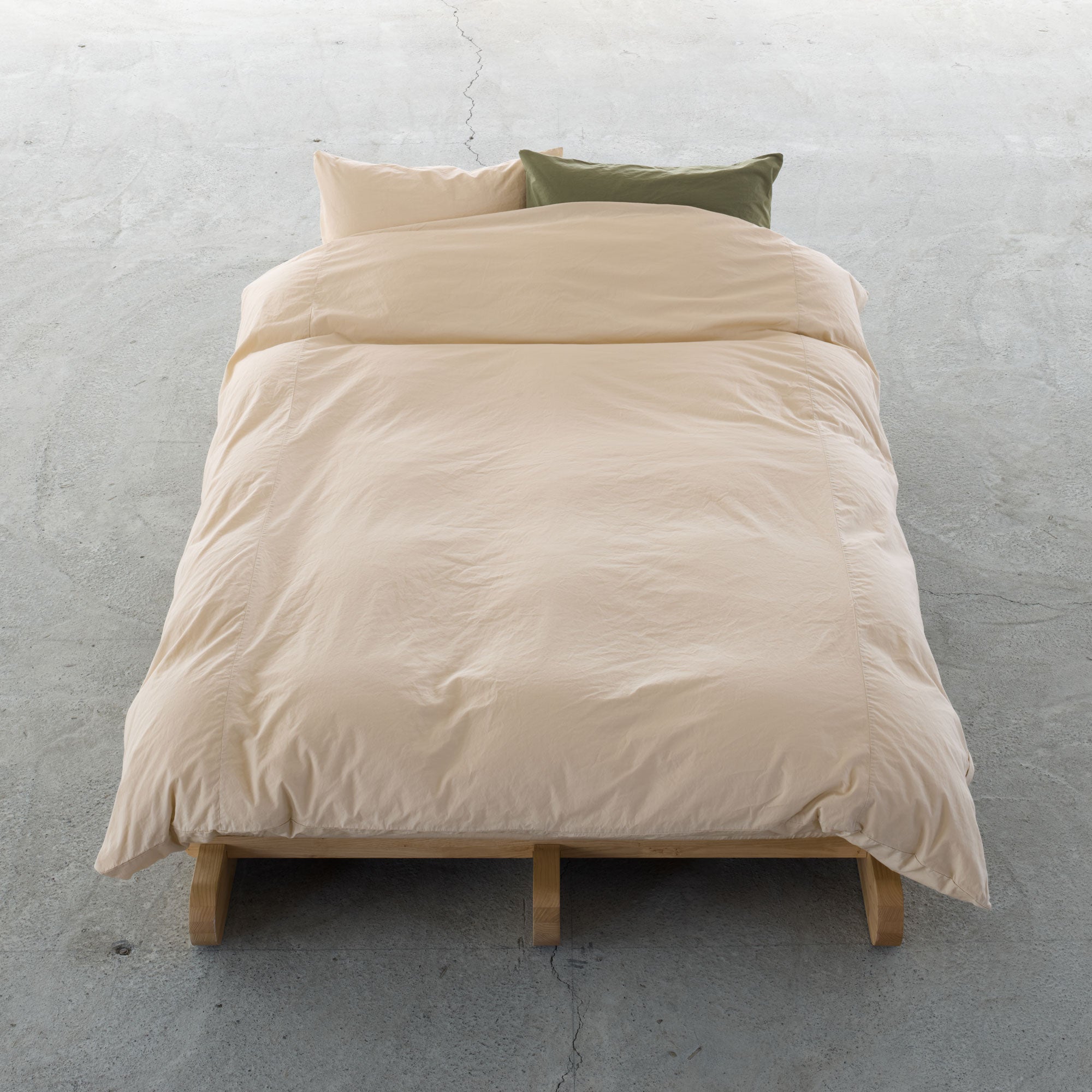 sinsoのカバーとシーツは生地の密度が高いため、はじめはシワに荒削りな印象があります。使い続けていくと、和紙のように柔らかく細かなシワに経年変化していき、やさしく身体に馴染み、この上ない安心感で包み込みます。